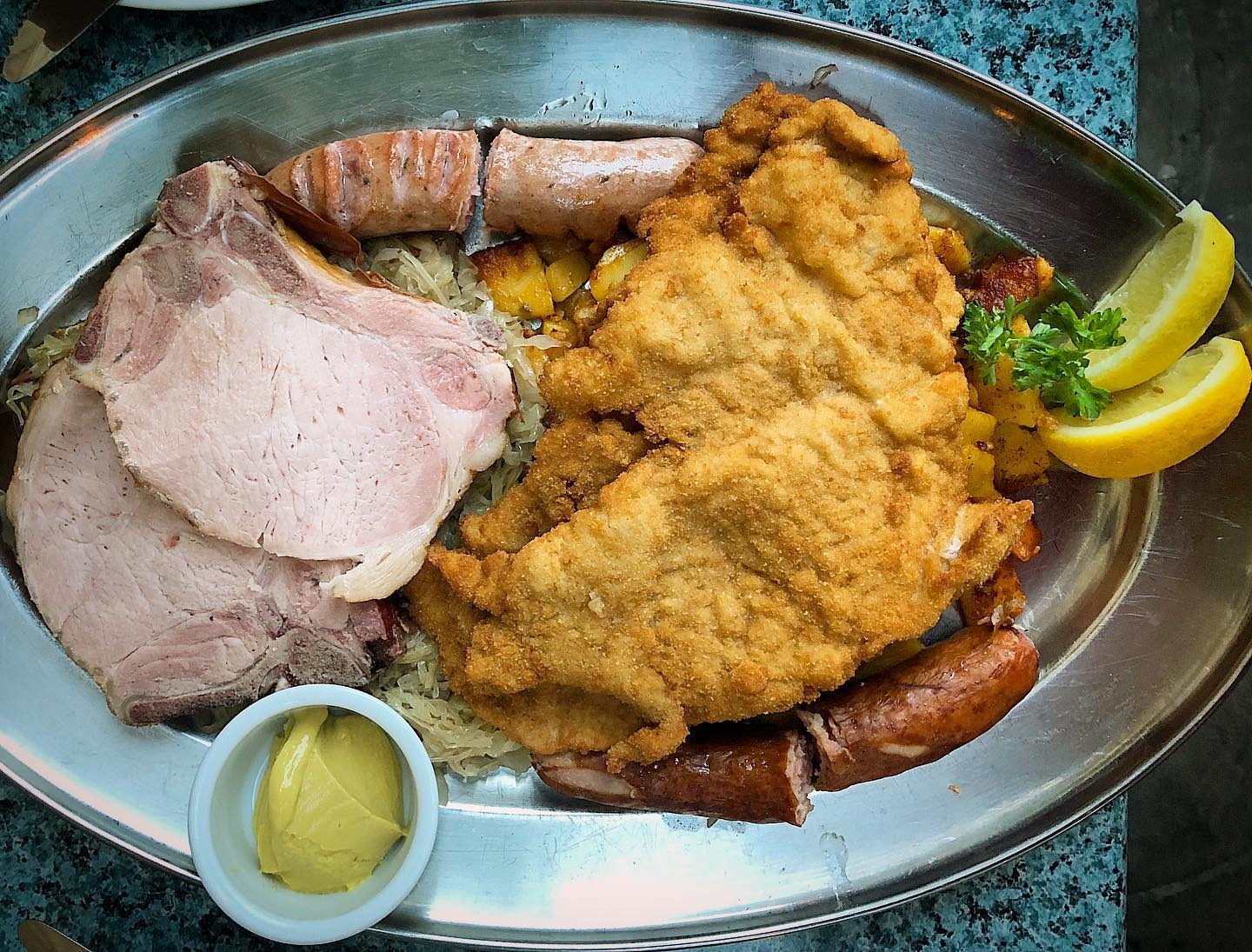 $105.95 Schnitzel, Pork Loin, Sausage, Home Fries and