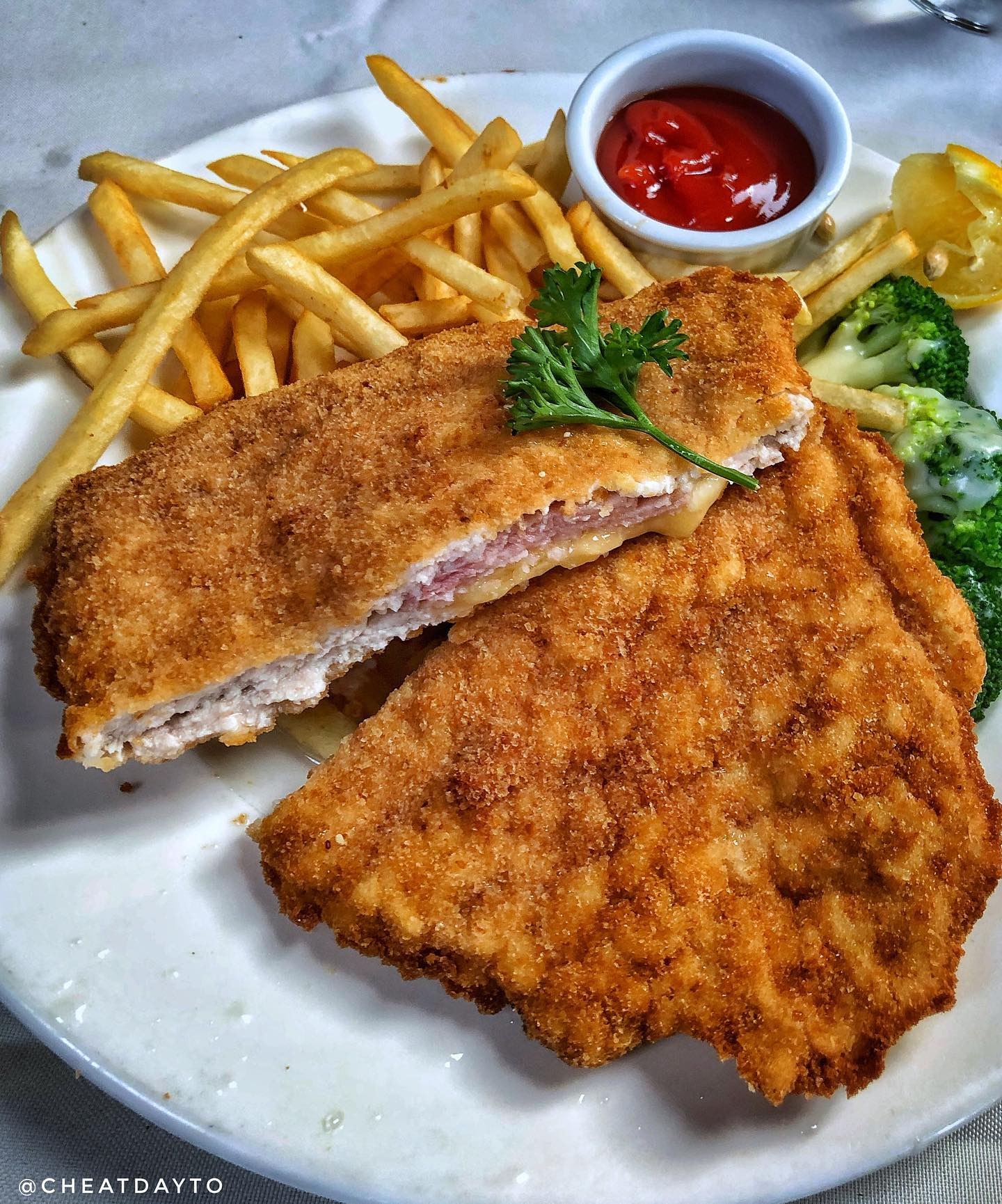 $25.95 Breaded Cutlet with Ham and Cheese Filling, served with Home Fries and Vegetables